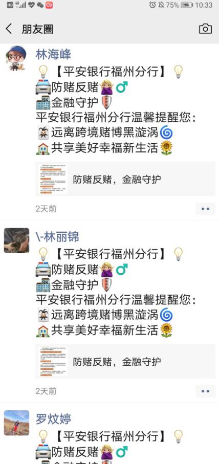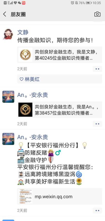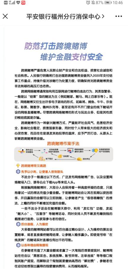 2020年“金融知识普及月 金融知识进万家 争做理性投资者 争做金融好网民”已经在榕城拉开序幕。平安银行福州分行在过去的一周都有什么精彩表现呢?让我们一起来回顾一下吧! 在过去的一周,平安银行福州分行的各支行网点伙伴们以厅堂为主要阵营,通过线上、线下模式组织开展形式各样丰富多样的金融知识宣传活动,尤其是针对进网点办理业务的老年人群体、青少年群体以及低净值人群等特殊人群做重点宣教普及工作。 一、网点线上宣传 (1)分行微信公众号推送消保金融知识:分行通过分行消保公众号制作 “防赌反赌”软文,并组织下辖支行通过微信朋友圈分享转发839次。