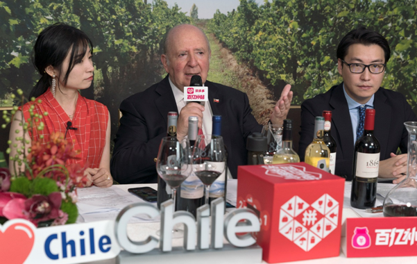 ▲智利驻华大使路易斯·施密特先生(中)与拼多多副总裁陈秋(右)一起做客“百亿补贴”官方直播间,带领消费者体验“舌尖上的智利”。(穆功 摄)
