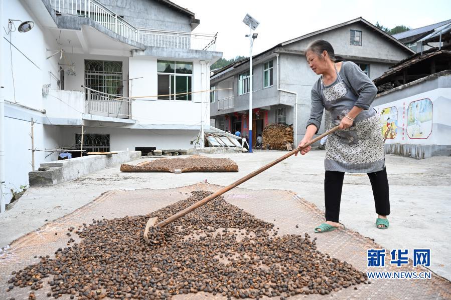 11月19日,岭下村村民在晾晒油茶籽。油茶种植是岭下村的主要特色农业,乡村旅游带动了油茶的销售,助力村民增收。新华社记者姜克红 摄