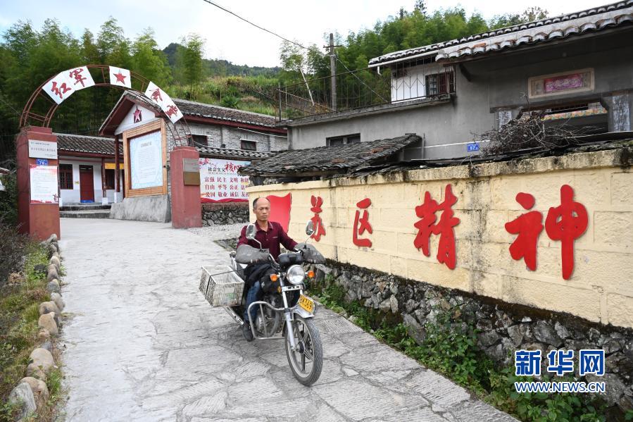 11月19日,承包村里红军食堂而脱贫的岭下村村民邓平青骑车外出。新华社记者姜克红 摄