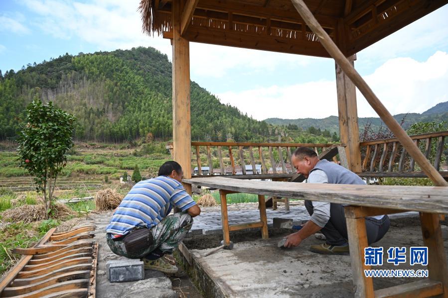 11月19日,岭下村村民在维修村里的凉亭。新华社记者姜克红 摄