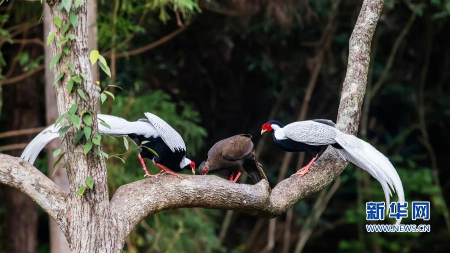 在永安市青水畲族乡丰田村,几只白鹇在林间的树枝上嬉戏(11月20日摄)。新华社记者 彭张青 摄