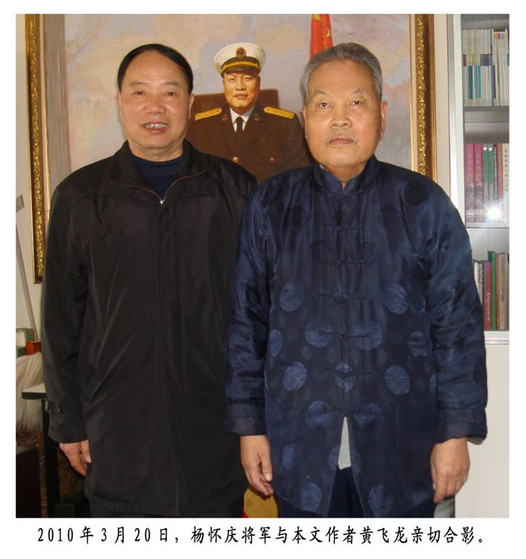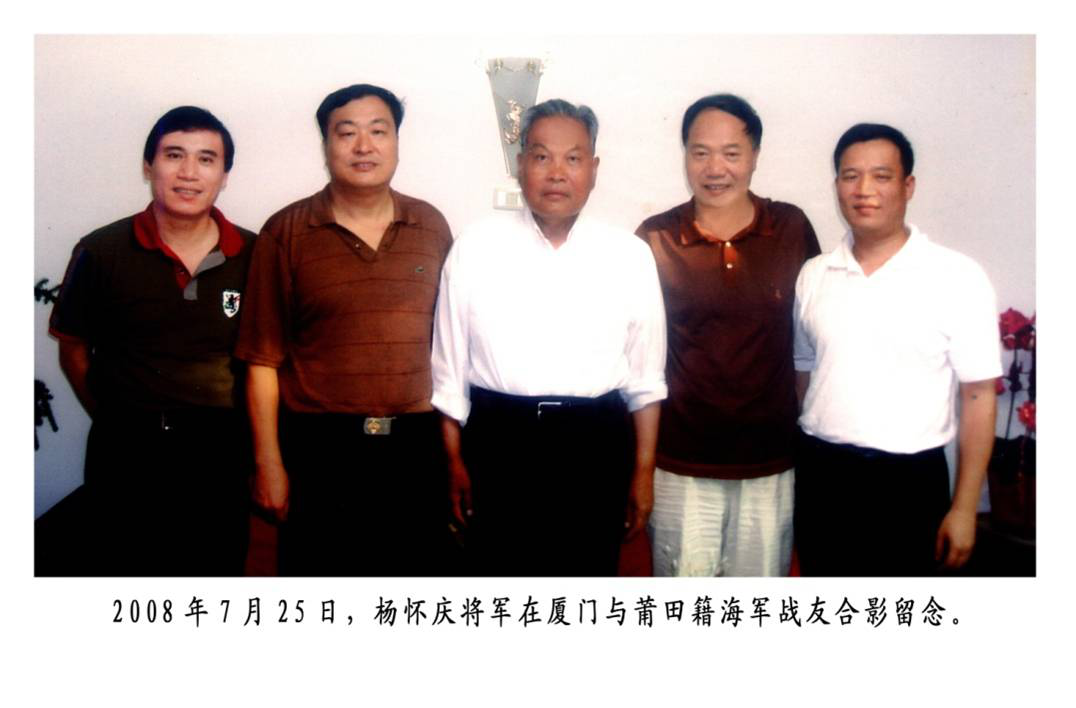 2010年3月20日,我带领两莆田籍战友刘国基、杨东阳赴京向老首长汇报,他抱重病会见我们。当他观看我编辑制作的《妈祖故乡海军情》《大海情》纪录片后,语重心长地再三叮嘱我今后要着重宣扬为地方建设做出重大贡献的战友企业家和各行业的优秀人才。尔后,老首长拖着病体、举步维艰带着我们上二楼,为前去的每人各写了一幅包含虎年特色的题字,我看着题字后脸颊冒汗的老首长,情不自禁一阵心酸,热泪盈眶;临别时,他还让工作人员在他的挂像前拍下他生前与我的最后一次合影。 返程途中,我心潮澎湃,热血沸腾,这是一次多么难忘的留影,是老首长与我之间深厚友谊的像征。“仁义为友、道德为师”“重金难买战友情”这些古训在此时此刻得到了充分的体现。 特别难忘的是,2012年2月22日上午,我带着两位战友企业家刘光荣、郑健前往北京海军总院看望病重中的老首长并给他送去我编辑的《莆田籍海军战友纪念册暨通讯录》,这是他生前与我的最后一次见面。当时杨将军非常高兴。当我们走到病榻旁,我向老首长行军礼时,躺在床上的他左手挂点滴,伸出右手给我回了个军礼。并把我赠他的纪念册放在枕边,说要认真仔细看。此情此景,令我刻骨铭心,永志难忘。 2012年12月12日下午4时许,我从宁波乘动车返家乡莆田途中,突然接到杨野平战友从北京传来了我心目中最敬重的老首长、海军原政委杨怀庆上将病逝的消息。噩耗传来,曾是杨将军老部下和36年挚友的我悲痛欲绝,当即致电其长女秀月并转朱秀英夫人表示吊唁,为我党我军失去这样一位政治坚定、德才兼备的儒将而倍加惋惜,为自己人生旅程失去这样一个良师益友、和蔼可亲的首长而深感痛心!