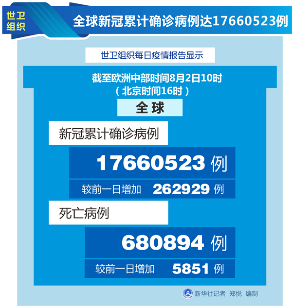 新华社日内瓦8月2日电(记者刘曲)世界卫生组织2日公布的最新数据显示,全球新冠累计确诊病例达17660523例。