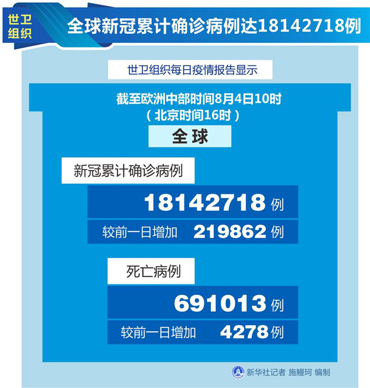 新华社日内瓦8月4日电(记者刘曲)世界卫生组织4日公布的最新数据显示,全球新冠累计确诊病例达18142718例。