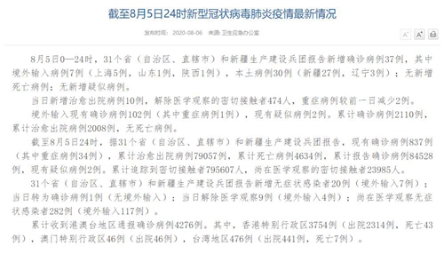 人民网北京8月6日电(董童)国家卫生健康委于今日在官网发布的《截至8月5日24时新型冠状病毒肺炎疫情最新情况》(以下简称“情况”)提出,8月5日0—24时,31个省(自治区、直辖市)和新疆生产建设兵团报告新增确诊病例37例,其中境外输入病例7例(上海5例,山东1例,陕西1例),本土病例30例(新疆27例,辽宁3例);无新增死亡病例;无新增疑似病例。当日新增治愈出院病例10例,解除医学观察的密切接触者474人,重症病例较前一日减少2例。