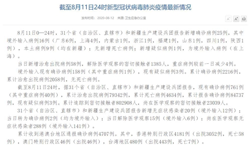 人民网北京8月12日电(董童)国家卫生健康委于今日在官网发布的《截至8月11日24时新型冠状病毒肺炎疫情最新情况》(以下简称“情况”)提出,8月11日0—24时,31个省(自治区、直辖市)和新疆生产建设兵团报告新增确诊病例25例,其中境外输入病例16例(广东6例,上海4例,内蒙古1例,浙江1例,福建1例,山东1例,四川1例,陕西1例),本土病例9例(均在新疆);无新增死亡病例;新增疑似病例1例,为境外输入病例(在上海)。当日新增治愈出院病例58例,解除医学观察的密切接触者1385人,重症病例较前一日减少4例。