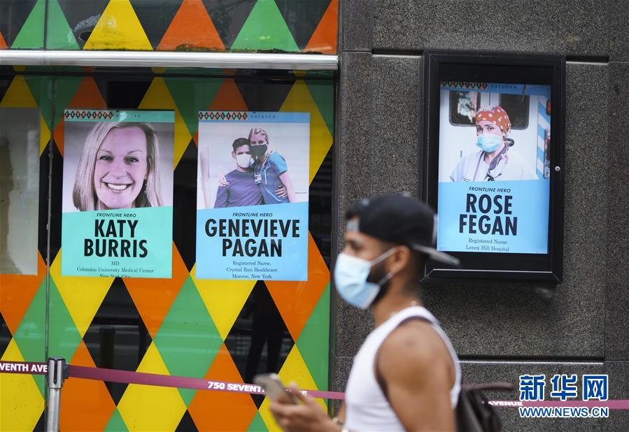 8月19日,在美国纽约,一名行人从街头向医护人员致敬的广告牌旁走过。 新华社记者 王迎 摄 |