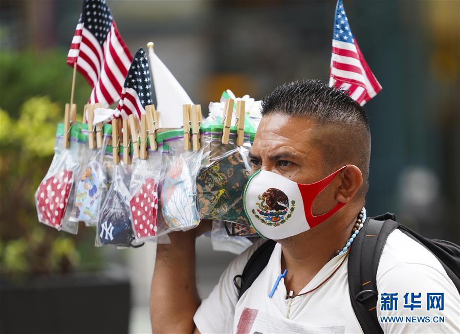 8月19日,一名小贩在美国纽约时报广场售卖口罩。 新华社记者 王迎 摄 目前美国累计确诊病例最多的州是加利福尼亚州,为640722例。佛罗里达州和得克萨斯州确诊病例均超过50万例,纽约州确诊病例超过40万例。累计确诊病例超过18万例的州还有佐治亚州、伊利诺伊州、亚利桑那州和新泽西州。