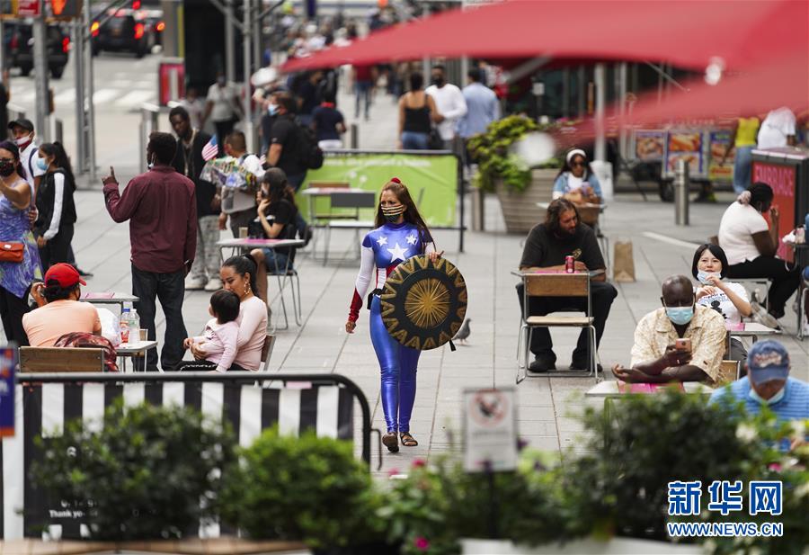 8月19日,一名街头表演者在美国纽约时报广场招揽顾客。 新华社记者 王迎 摄