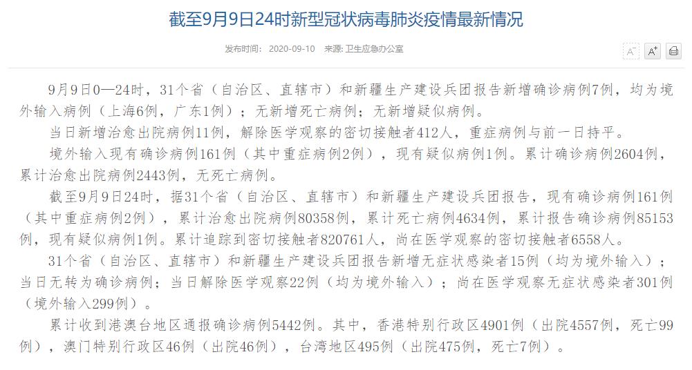 人民网北京9月10日电(董童)国家卫生健康委于今日在官网发布的《截至9月9日24时新型冠状病毒肺炎疫情最新情况》(以下简称“情况”)提出,9月9日0—24时,31个省(自治区、直辖市)和新疆生产建设兵团报告新增确诊病例7例,均为境外输入病例(上海6例,广东1例);无新增死亡病例;无新增疑似病例。当日新增治愈出院病例11例,解除医学观察的密切接触者412人,重症病例与前一日持平。