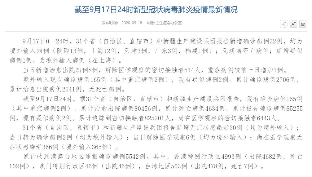 人民网北京9月18日电(董童)国家卫生健康委于今日在官网发布的《截至9月17日24时新型冠状病毒肺炎疫情最新情况》(以下简称“情况”)提出,9月17日0—24时,31个省(自治区、直辖市)和新疆生产建设兵团报告新增确诊病例32例,均为境外输入病例(陕西13例,上海12例,天津3例,广东3例,福建1例);无新增死亡病例;新增疑似病例1例,为境外输入病例(在上海)。当日新增治愈出院病例8例,解除医学观察的密切接触者514人,重症病例较前一日增加1例。