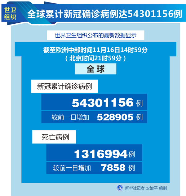 新华社日内瓦11月16日电(记者刘曲)世界卫生组织16日公布的最新数据显示,全球累计新冠确诊病例达54301156例。