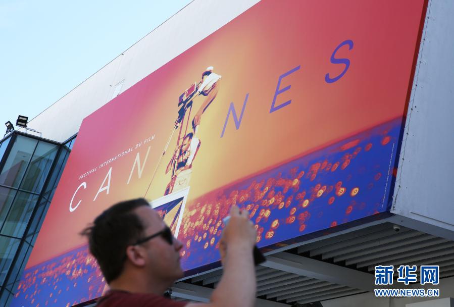 这张2019年5月13日拍摄的资料照片显示,一名男子在法国戛纳电影宫外拍摄第72届戛纳电影节巨幅海报。