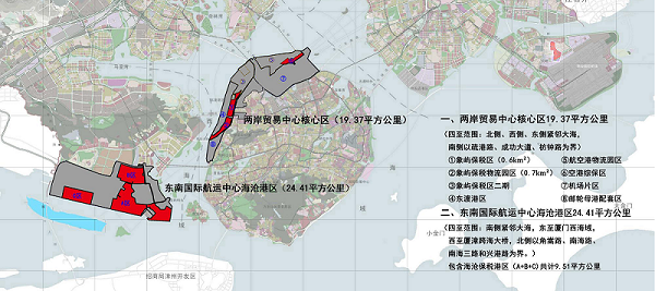 (一) 东南国际航运中心海沧港区 实施范围:区域面积24.41平方公里,四至范围:南侧紧邻大海,东至厦门西海域,西至厦漳跨海大桥,北侧以角嵩路、南海路、南 海三路和兴港路为界。 功能定位:发展航运物流、口岸进出口、保税物流、加工增值、服 务外包、大宗商品交易等现代临港产业,构建高效便捷、绿色低碳的物流网络和服务优质、功能完备的现代航运服务体系,成为立足 海西、服务两岸、面向国际,具有全球航运资源配置能力的亚太地区重要的集装箱枢纽港。 (二) 两岸贸易中心核心区 实施范围:区域面积19.37平方公里,四至范围:北侧、西侧、东侧紧邻大海,南侧以疏港路、成功大道、枋钟路为界。 功能定位:发展高新技术研发、信息消费、临空产业、国际贸易服务、金融服务、专业服务、邮轮经济等新兴产业和高端服务业,构建两岸经贸合作最紧密区域,成为立足大陆,面向亚太地区的区域性国际贸易中心。 |