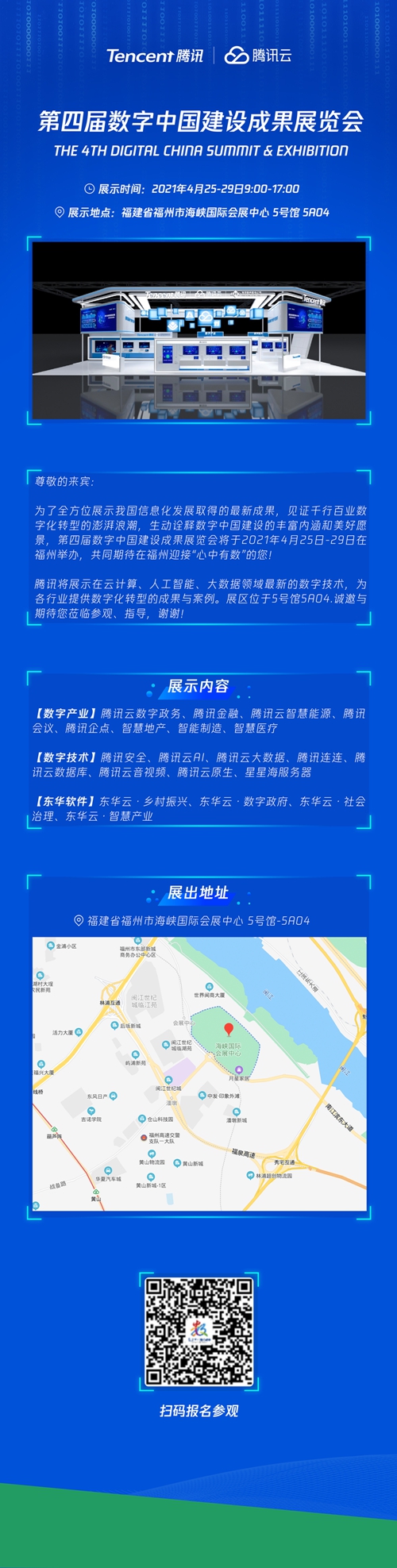 第四届数字中国建设成果展览会腾讯展台。腾讯供图 本届成果展,腾讯展区面积为216平方米,整体空间规划分为数字产业展示区、数字技术展示区、生态合作展示区(以腾讯生态伙伴东华软件为主)三个模块。重点呈现腾讯在云计算、大数据、AI等数字新基建领域的技术成果,各行业数字化转型升级解决方案,助力各行业数字化信息化高质量发展。 展区位置 福建省福州市海峡国际会展中心 5号馆 5A04 展览时间 2021年4月25日-29日 展示内容 ● 数字技术展示区域:云AI+大数据、物联网、音视频通信 、腾讯安全、数据库 、星星海服务器 、云原生技术; ● 数字产业展示区域:腾讯云数字政务、数字乡村、腾讯云会展、智慧地产、智慧工业、智慧能源、腾讯企点、腾讯会议、腾讯智慧医疗、智慧金融 ● 生态合作:东华软件