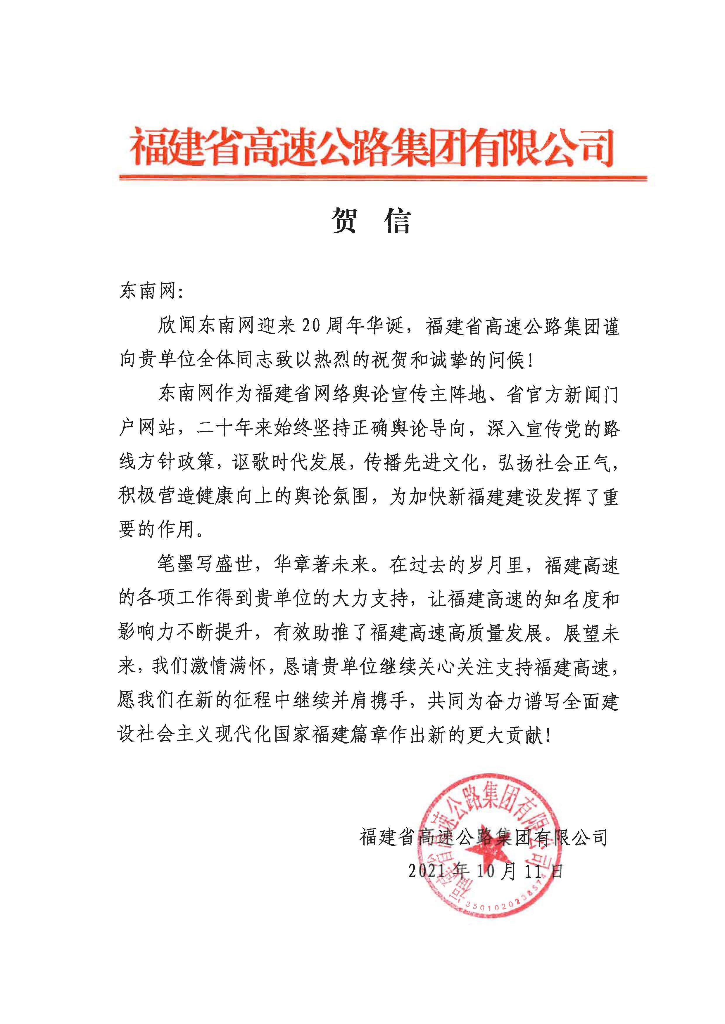 福建省高速公路集团有限公司致东南网20周年贺信