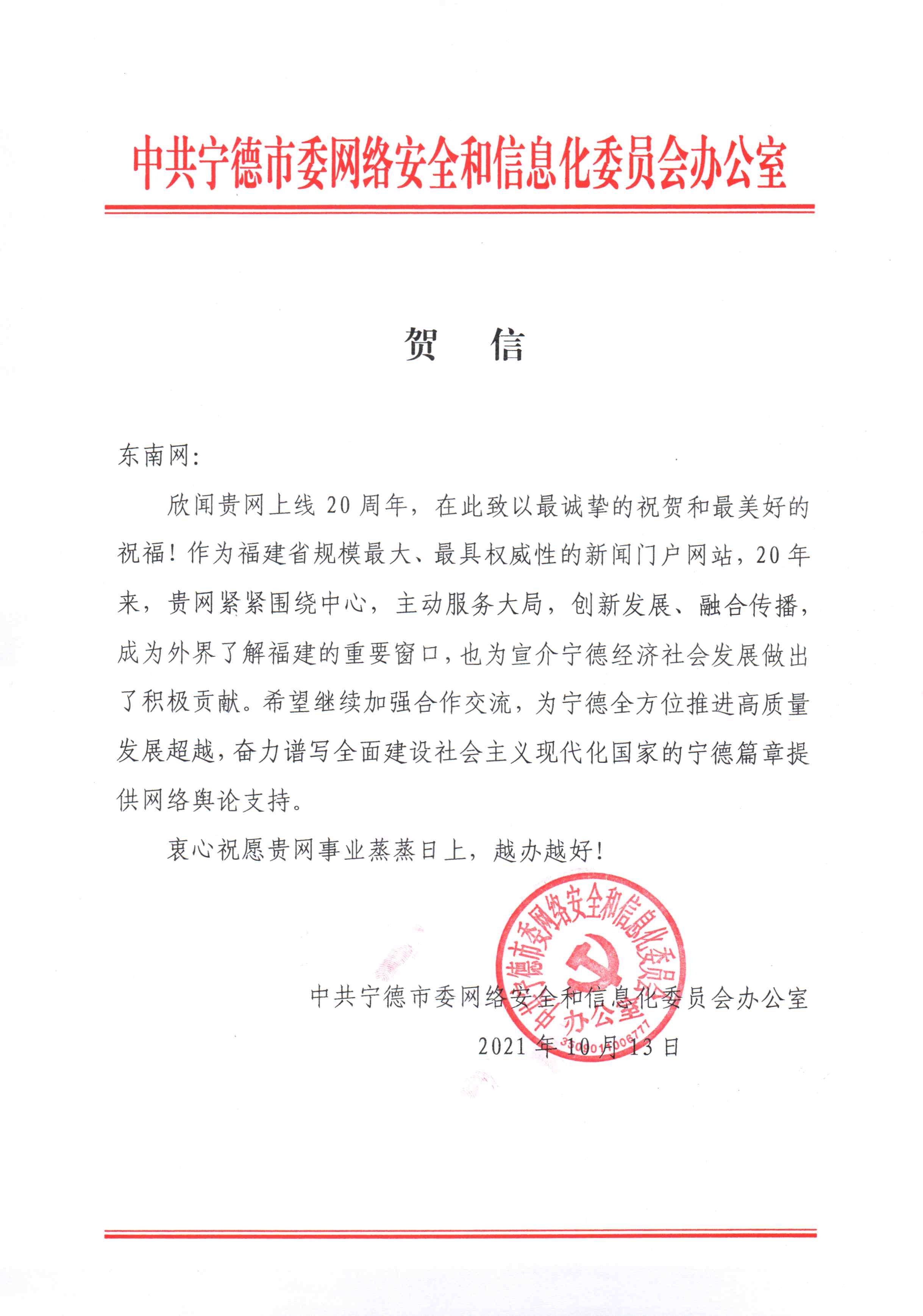 中共宁德市委网络安全和信息化委员会办公室贺信