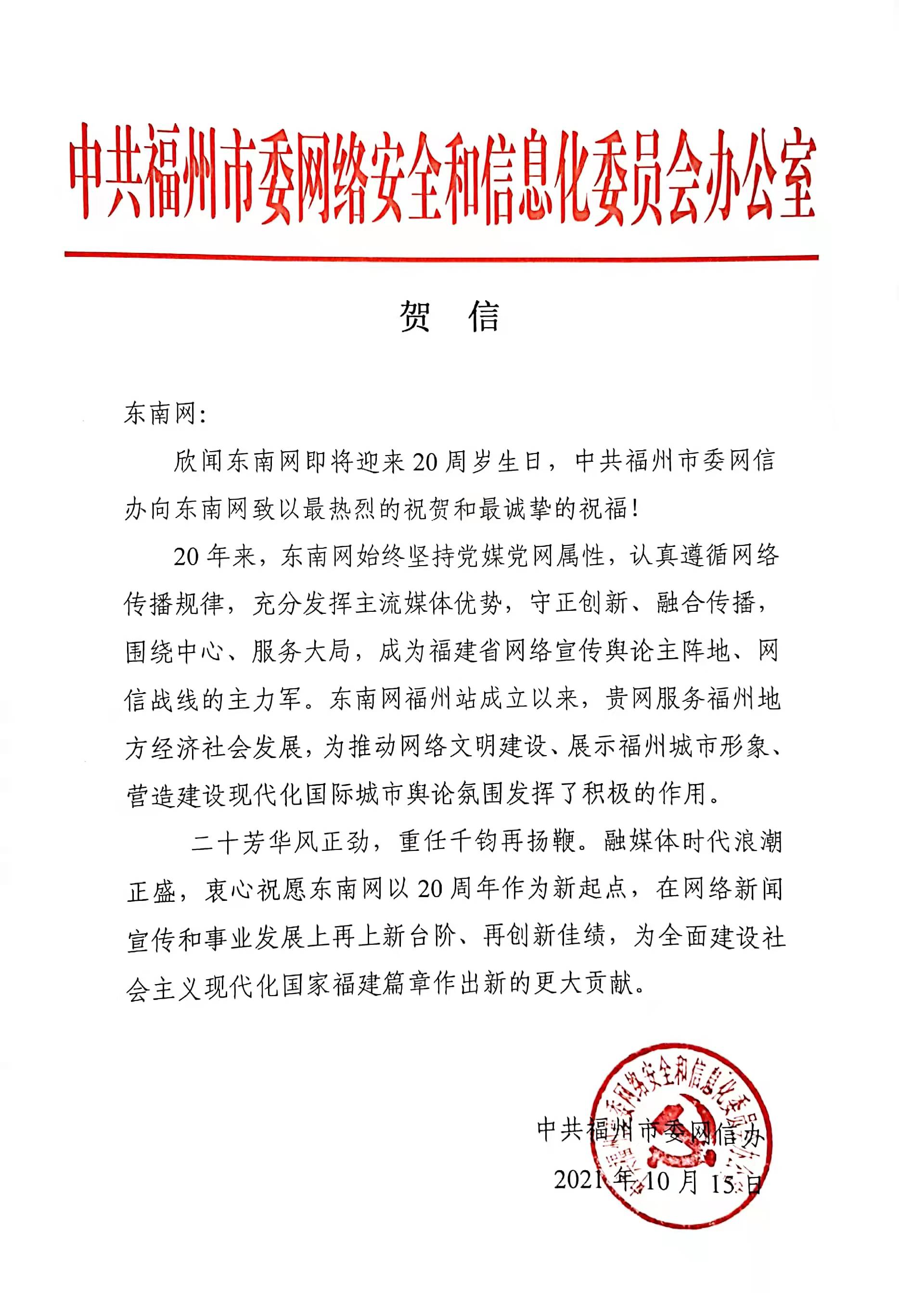 中共福州市委网络安全和信息化委员会办公室贺信