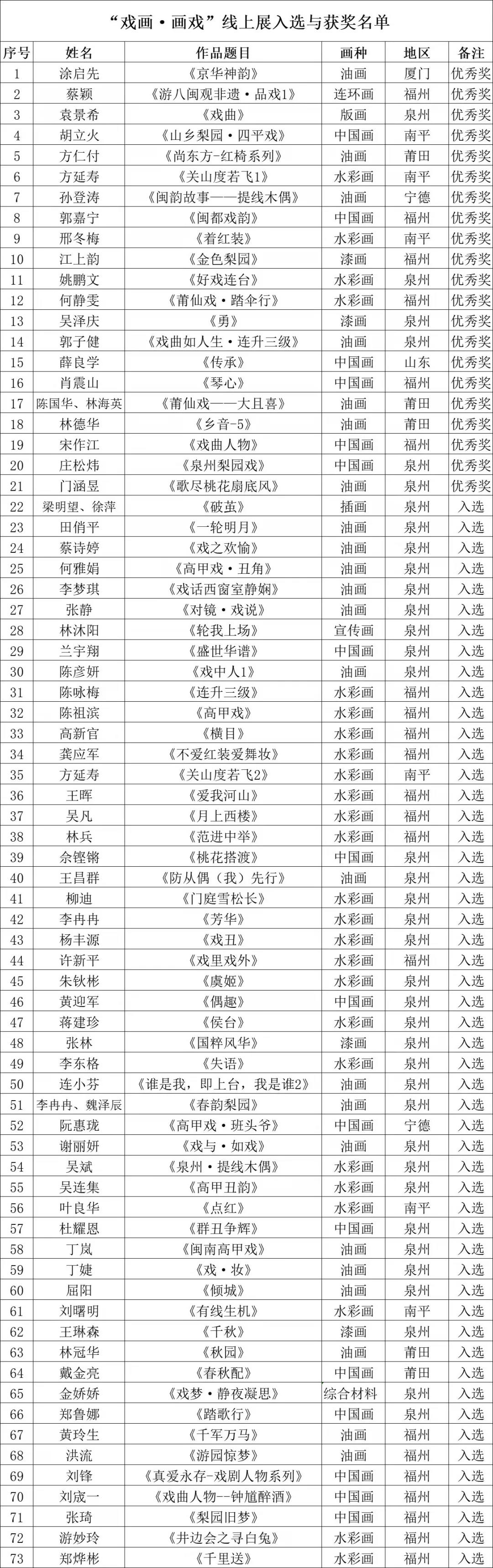 ![]() 自福建省艺术研究院面向全省发起“画戏·戏画”美术作品征稿活动以来,得到了全省广大艺术家以及绘画爱好者们的积极响应,踊跃投稿。截止截稿日期,一共收到来自全省九地市128位作者的共计156件作品。其中涉及国画、油画、版画、水彩画、水粉画、漆画、连环画等诸多画种,经过初评,复评,总共选出作品73件,其中优秀奖作品21件,入展作品52件,入选及获奖作品名单详见下文表格。同时特邀省美协原副主席王新伦、省画院院长张永海等13位名家创作画作14幅。此次活动着眼于福建传统戏曲艺术,表现了包括舞台美术、人物造型、服装道具等与传统戏曲相关的内容,佳作频出,精彩纷呈,将以线上展览的形式在第八届福建艺术节期间由福建省艺术研究院公众号发布。 中国戏曲艺术是我国传统的艺术文化形式,凝聚了中华传统文化的美学思想精髓,博大精深。福建戏曲以其丰富的剧种、深厚的历史、鲜活的特色在全国独树一帜,戏曲艺术与绘画的结合,根植于中华民族的文化沃土,具有共同的哲学渊源和共同的美学特征,具有同样的美学追求和相似的艺术手法,两者相互影响相互贯通。以“绘画”来表现“戏曲”,珠联璧合,使绘画散发独特的艺术魅力。在第八届福建艺术节期间,还特别邀请了画家薛国平先生,于2021年12月23日在福建芳华越剧院尹语小剧场开设讲座,为广大朋友解读戏曲与绘画的结合,并畅谈自身绘画创作的经验与心得。 ![]() ![]() ![]() |