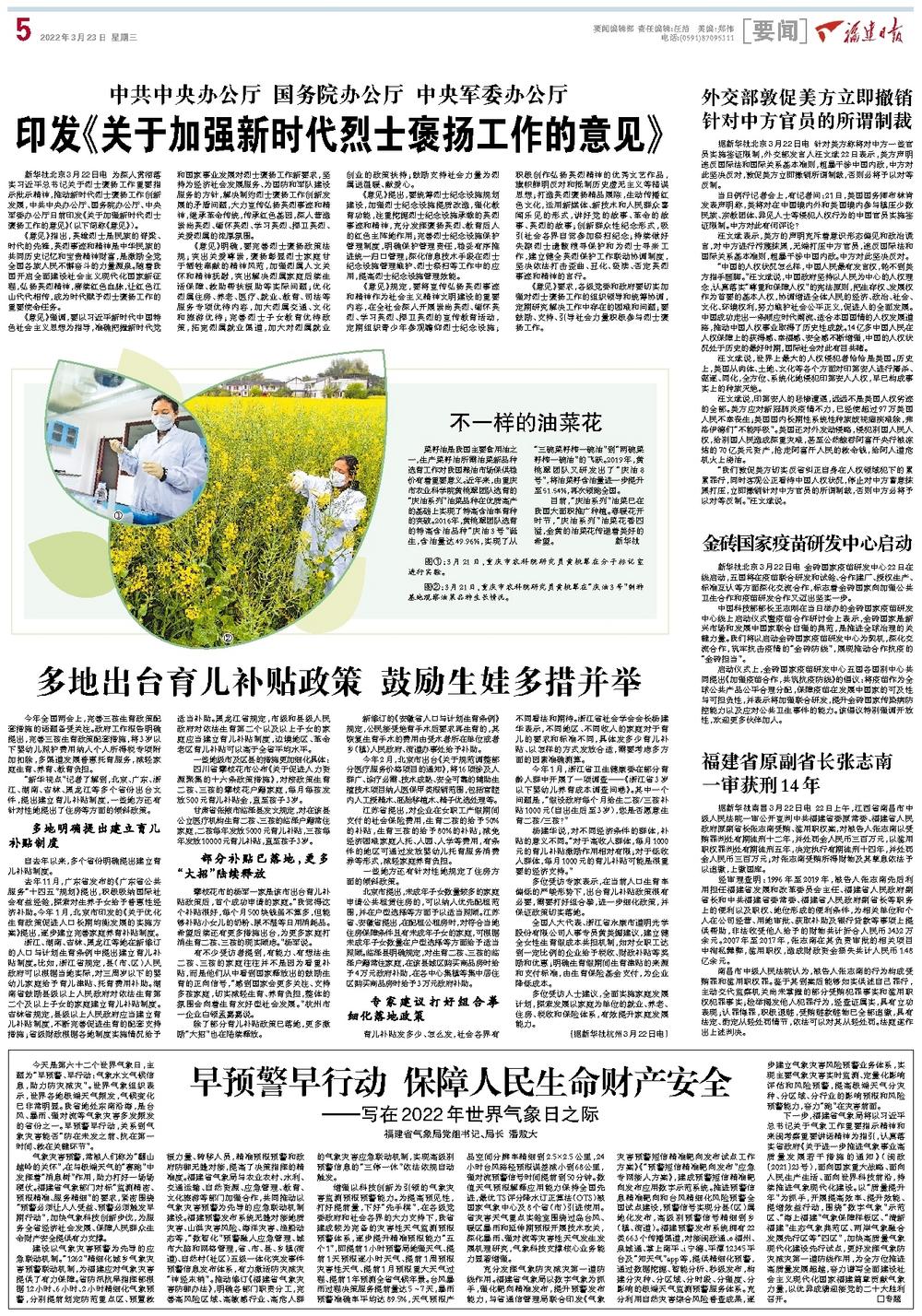 3月23日,福建日报刊发了福建省气象局党组书记、局长潘敖大的署名文章《早预警早行动 保障人民生命财产安全——写在2022年世界气象日之际》。全文转载如下。 早预警早行动 保障人民生命财产安全 ——写在2022年世界气象日之际 潘敖大 今天是第六十二个世界气象日,主题为“早预警、早行动:气象水文气候信息,助力防灾减灾”。世界气象组织表示,世界各地极端天气频发,气候变化已非常明显。我省地处东南沿海,是台风、暴雨、强对流等气象灾害多发频发的省份之一。早预警早行动,关系到气象灾害能否“防在未发之前、抗在第一时间、救在关键环节”。 气象灾害预警,常被人们称为“翻山越岭的关怀”,在与极端天气的“赛跑”中发挥着“消息树”作用,助力打好一场场硬仗。福建省气象部门对标“监测精密、预报精准、服务精细”的要求,紧密围绕“预警必须让人人受益、预警必须触发早期行动”,加快气象科技创新步伐,为服务全省经济社会发展、保障人民群众生命财产安全提供有力支撑。 建设以气象灾害预警为先导的应急联动机制。“1262”精细化城乡气象灾害预警联动机制,为福建应对气象灾害提供了有力保障。省防汛抗旱指挥部根据12小时、6小时、2小时精细化气象预警,分别提前划定防范重点区、预置救援力量、转移人员,精准预报预警和政府防御无缝对接,提高了决策指挥的精准度。福建省气象局与农业农村、水利、交通运输、自然资源、应急管理、教育、文化旅游等部门加强合作,共同推动以气象灾害预警为先导的应急联动机制建设。福建预警发布系统无缝对接地质灾害、山洪灾害风险、海洋灾害、渔船动态等,“数智化”预警融入应急管理、城市大脑和网格管理,省、市、县、乡镇(街道)、自然村(社区)五级一体化突发事件预警信息发布体系,有力激活防灾减灾“神经末梢”。推动修订《福建省气象灾害防御办法》,明确各部门职责分工,完善高风险区域、高敏感行业、高危人群的气象灾害应急联动机制,实现高级别预警信息的“三停一休”依法依规自动触发。 增强以科技创新为引领的气象灾害监测预报预警能力。为提高预见性,打好提前量,下好“先手棋”,在各级党委政府和社会各界的大力支持下,我省建成较为完备的灾害性天气监测预报预警体系,逐步提升精准预报能力“五个1”,即提前1小时预警局地强天气、提前1天预报逐小时天气、提前1周预报灾害性天气、提前1月预报重大天气过程、提前1年预测全省气候年景。台风暴雨过程决策服务提前量达5~7天,暴雨预警准确率平均达89.5%,天气预报产品空间分辨率精细到2.5×2.5公里,24小时台风路径预报误差减小到68公里,强对流预警信号时间提前到50分钟。数值天气预报解释应用能力保持全国先进,最优TS评分降水订正算法(OTS)被国家气象中心及8个省(市)引进使用。省灾害天气重点实验室围绕过岛台风、暖区暴雨和延伸期预报开展技术攻关,深化暴雨、强对流等灾害性天气发生发展机理研究,气象科技支撑核心业务能力显著增强。 充分发挥气象防灾减灾第一道防线作用。福建省气象局以数字气象为抓手,强化靶向精准发布,提升预警发布能力,与省通信管理局联合印发《气象灾害预警短信精准靶向发布试点工作方案》《“预警短信精准靶向发布”应急专网接入方案》,建成预警短信精准靶向发布应用数字示范系统。推进预警信息精准靶向和台风精细化风险预警全国试点建设,预警信号实现分县(区)属地化发布,高级别预警信号精细到乡(镇、街道)。福建预警发布系统拥有22类663个传播渠道,对接闽政通、e福州、泉城通、掌上南平、i宁德、平潭12345平台及“知天气”app等,提供精细化预警,通过数据挖掘、智能分析、秒级发布,构建分灾种、分区域、分时段、分强度、分影响的极端天气监测预警服务体系。充分利用自然灾害综合风险普查成果,逐步建立气象灾害风险预警业务体系,实现主要气象灾害实时监测、定量化影响评估和风险预警,提高极端天气分灾种、分区域、分行业的影响预报和风险预警能力,奋力“跑”在灾害前面。 下一步,福建省气象局将以习近平总书记关于气象工作重要指示精神和来闽考察重要讲话精神为指引,认真落实省政府《关于进一步推进气象事业高质量发展若干措施的通知》(闽政〔2021〕23号),面向国家重大战略、面向人民生产生活、面向世界科技前沿,持续推进气象现代化建设。以“质量提升年”为抓手,开展提高效率、提升效能、提增效益行动,围绕“数字气象”示范区、“海上福建”气象保障样板区、“清新福建”生态气象典范区、两岸气象融合发展先行区等“四区”,加快高质量气象现代化建设先行试点,更好发挥气象防灾减灾第一道防线作用,为全方位推进高质量发展超越,奋力谱写全面建设社会主义现代化国家福建篇章贡献气象力量,以优异成绩迎接党的二十大胜利召开。