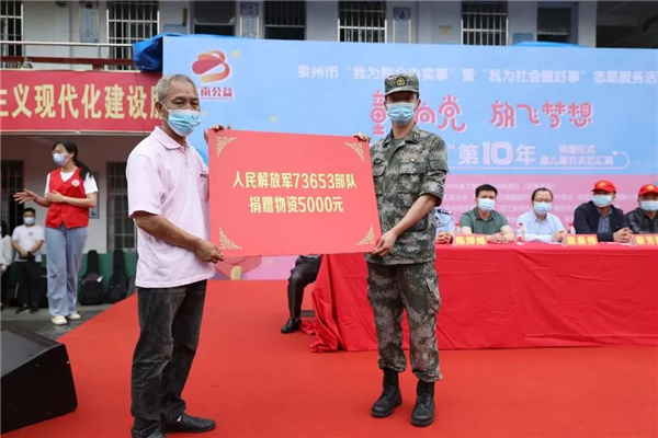 许燕喜是一名兵支书,这些年,他带领居民奔小康,抓防控,又把儿子送到部队,如今儿子在部队有出息,他自然很高兴。看到是学校少先队员来送喜报,许燕喜表示:“真的没想到,这种做法很好,送喜报既是对我儿子的肯定,也是传承红色基因最直接的方式” “孩子们,你们是祖国的未来,希望你们像军人一样,学好本领、强身健体,做好新时代的接班人!”在随后的交流座谈中,许燕喜欣喜地把自己从军经历,以及带领居民奋斗在抗疫一线的故事讲给他们听,孩子们认真聆听着,眼里泛着泪光…… 泉州市安溪县 5月27日,“童心向党放飞梦想”——东南公益“爱心午餐”第10年捐赠仪式暨儿童节文艺汇演在泉州安溪县剑斗镇潮碧小学举行,中国人民解放军73653部队和来自社会各界的爱心人士,带着精心准备的节日礼物,陪伴71名学生们提前欢度儿童节。