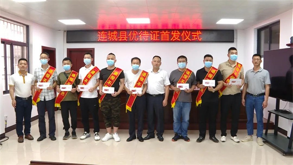 6月20日,龙岩市连城县举行首批退役军人及其他优抚对象优待证发放仪式,现场为9名成功申领优待证的退役军人代表颁发优待证,标志着连城县退役军人及其他优抚对象优待证发放工作正式开始。县委常委、副县长林威,县退役军人事务局主要负责人等参加发放仪式。