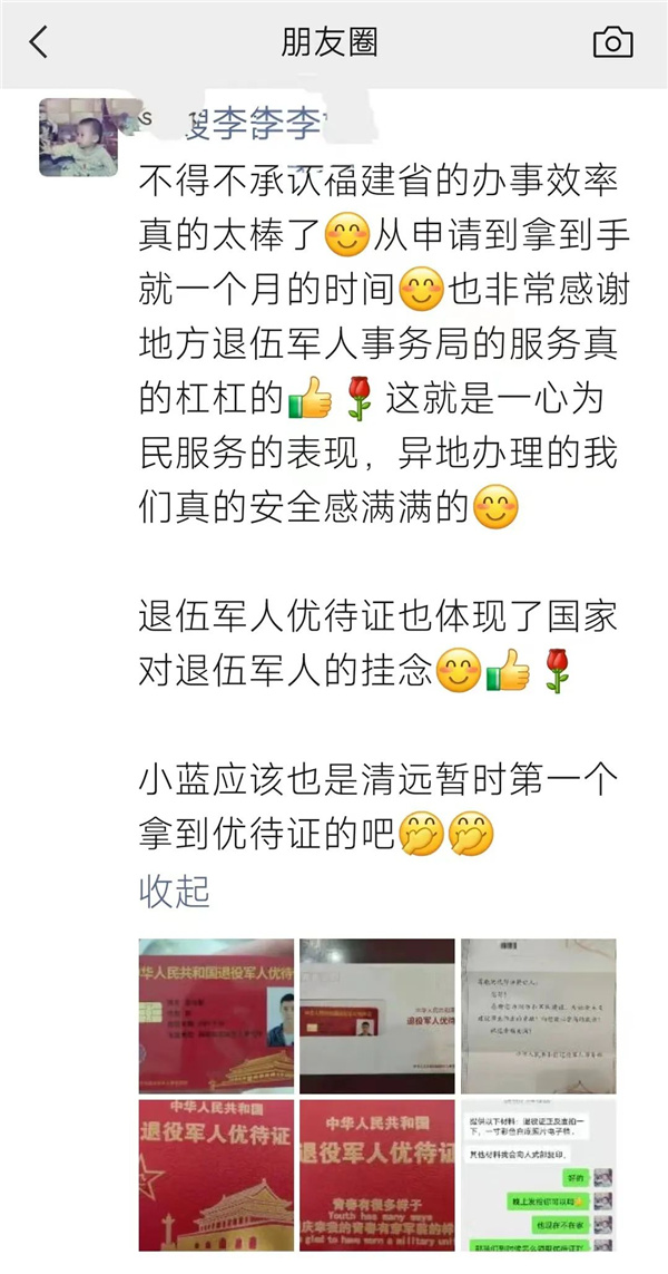▲小蓝妻子小李发的朋友圈 自优待证办理工作启动以来,武平县退役军人服务中心抽调两名退役军人、党员专门负责,在网络技术支撑、业务办理培训、电子档案分类、办公设备配备、专业人员选配、办理进度跟踪等方面进行了合理调度和精准选配。截至目前,武平县优待证办理进入正常操作阶段,全县17个乡镇和县退役军人服务中心均可为全县退役军人提供优质、快捷的服务。同时与三家银行、县医院、中国石油武平公司、梁野山景区、教育基地等多家单位和企业签订优待服务协议,让更多的退役军人持优待证能够享受到更好的服务和更优惠的活动,不断提升荣誉感和幸福感。 |