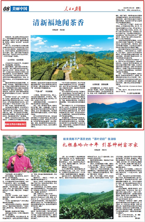 8月23日,《人民日报海外版》08版头条刊发报道《清新福地闻茶香》,点赞福建省泉州市安溪县以气象服务赋能生态茶园,护好生态种好茶、“一片叶子富全县”。