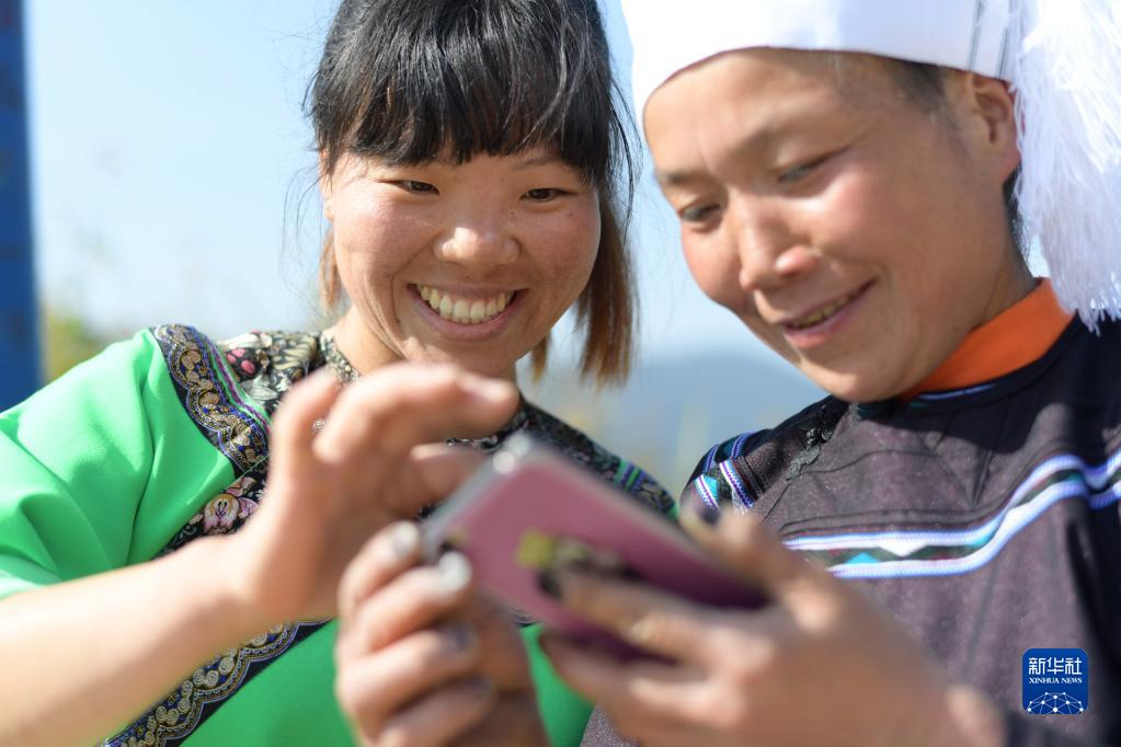在贵州省黔东南苗族侗族自治州榕江县水尾水族乡拉术村,一位村民(右)在学习使用手机(2020年10月24日摄)。新华社记者 杨楹 摄 十年来,各地不断推动“互联网+政务服务”发展,从“线下跑”“分头办”向“网上办”“协同办”转变,以数字化推进治理现代化。
