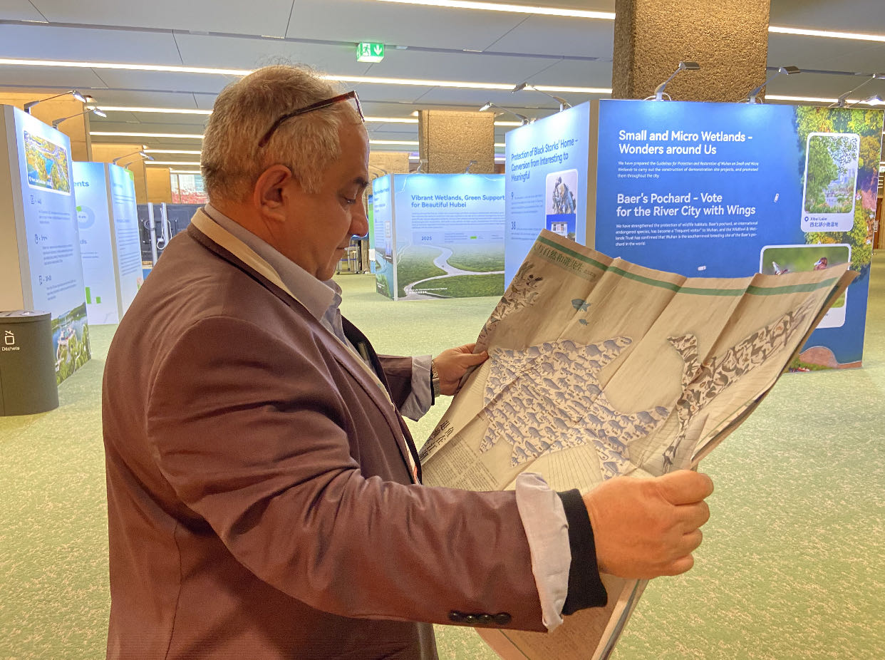 日内瓦会场与会专家阅读长江日报特派记者带去的《珍爱湿地》8连版特刊。长江日报供图