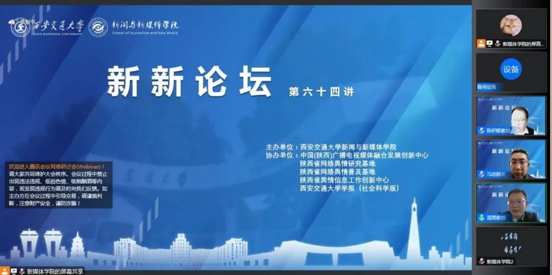 近日,西安交通大学新闻与新媒体学院的新新论坛第六十四讲在线举行。此次论坛上,中国人民大学新闻学院执行院长周勇与西安交通大学教授、陕西智媒研究基地主任陈积银围绕我国的新闻传播体系分别以“元问题、基本面向与焦点领域:中国特色新闻传播学知识体系的建构逻辑与实践进路”与“人工智能视角下的国际传播体系”为主题展开了精彩分享。论坛由西安交通大学新闻与新媒体学院马忠院长主持,副院长张宏邦教授作总结发言,吸引了来自校内外学界、业界等300余人参与。