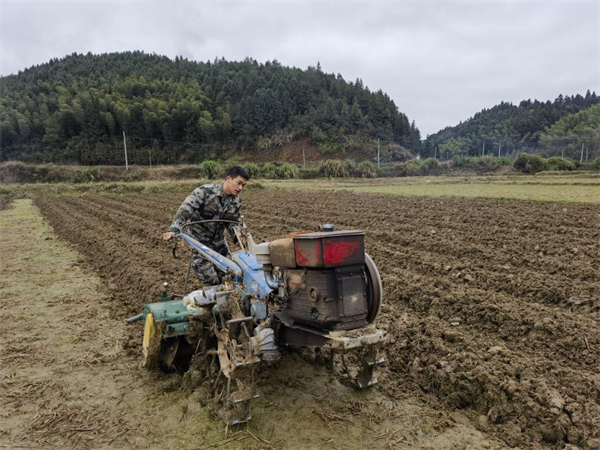 小山村里的奋斗者 2009年从部队退役的丁水财开过出租车,当过小时工,也做过生意,多地辗转了8年,时值28岁的他上有老下有小,繁忙的工作让他无暇顾及家人的生活,不能时常陪伴父母、妻子和孩子让丁水财感到十分愧疚。2017年,他毅然放弃了手头的事业,回到了下渠镇陈元村,自小与土地打交道的他靠着自身丰富的经验扛起了铁锹和锄头,准备在水美土沃的家乡大干一场。 “一开始,很多人劝我种经济作物,说更挣钱,但我从小就听着老人家讲没粮吃的苦日子,所以我选择种粮,而且要多种粮、种好粮。”刚回村里的那两年,他一门心思埋头苦干,但当理想扎根现实,艰难往往是超出想象的,病虫害、种植技术、人力有限等一系列问题接踵而至,远没有想象中那么简单。曾在军营淬炼过的他始终坚持迎难而上,技术不精就努力学习。就这样,丁水财的身影经常穿梭于各户田野,经常参加各级农业技能培训;渐渐地,良种陆续入田,结合科学有序的田间管理,丁水财迎来了第一个大丰收。这更加坚定了他种粮的决心,“习近平总书记说,中国人的饭碗要牢牢端在自己手里。我们就得按照习近平总书记说的,多种粮、种好粮,把这粮食的饭碗端的更牢。”丁水财说道。 振兴路上的新农人 近几年,由于外出务工人员多,缺少劳动力,导致出现了不同程度的耕地撂荒现象。看着村里的撂荒地越来越多,丁水财心里止不住地惋惜。在镇党委的带领下、村两委的帮助下,他通过与农户签订合同流转土地的方式,将下渠、陈元等村的撂荒地复耕复种,综合应用农机与农艺配套栽培技术开展烟叶、水稻种植。现如今,丁水财的农耕面积从原来的7亩扩大到40余亩,年收入也从原来的7万元增长到30万元,他的种植大业越做越红火。作为农民中的新生力量,在自己增收之余,他还雇佣部分农户帮忙进行土地托管,时不时的向他们传授农技知识,提升耕种水平,进一步增加农户收入。