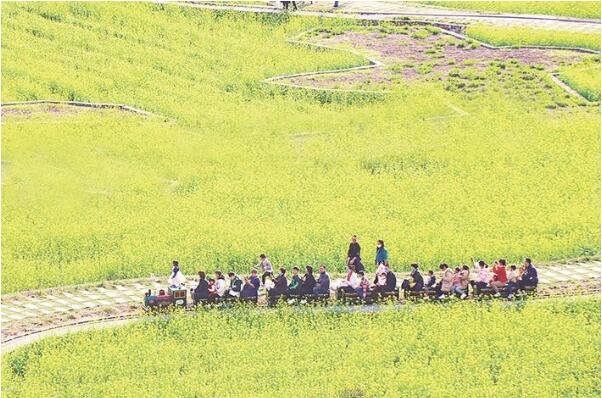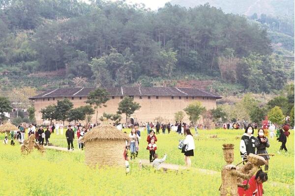 土楼与油菜花海相得益彰 油菜花 满目金黄春意浓 春节假期,不少人的朋友圈被华安大地土楼群景区的油菜花海刷屏。在蓝天白云的陪衬下,远处连绵的青山、近处古老的土楼群和这片金黄花海构成了一幅醉人的乡村画卷。 油菜花海里游人如织,四处可见拍照留影的人,想留住眼前的春色。年轻人们举起自拍杆,在花丛中定格自己的笑颜。孩子们也找到了乐趣,嬉笑着追逐飞舞的蝴蝶,往花丛深处去。周边铺设了小火车轨道,家长带着孩子坐上小火车,不到10分钟即可将这60亩金色花海的美景赏个遍。为了更好地留住客人,景区还在花海中布置了稻草造景,有巨型稻草人、恐龙、大猩猩等卡通造型,吸引不少孩子来“打卡”。 赏过油菜花海,再去逛逛土楼群,行程更充实。华安大地土楼群由“土楼之王”二宜楼、“福建土楼博物馆”南阳楼、“宜居典范”东阳楼组成,是福建土楼建筑的代表。景区工作人员透露,多数游客将逛土楼、赏花打包一起玩。春节期间,景区的客流量达到2.5万人次,目前日均客流量在1000人左右,热度不减。 景区还推出了优惠政策,2月28日前购买土楼(华安)景区门票(全价票70元),可赠送秋千谷景区入园门票或者土楼观光车车票+油菜花海小火车票。