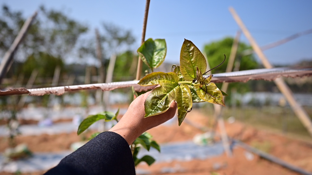 漳州市气象局高级工程师施宗强就是“百香果气象服务群”里的气象专家之一,也是杨开发的“老熟人”。在观察农场里作物的生产状况之后,施宗强再三嘱托不要因为气温回升就放松警惕。“3月份漳州总体气温偏高,日照充足,适合百香果生长。”施宗强说,“近期降水不多,水分管理非常重要。现在是百香果定植阶段,浇足定根水,盖好防草布,防草保湿,后期管理也需要及时浇水。”