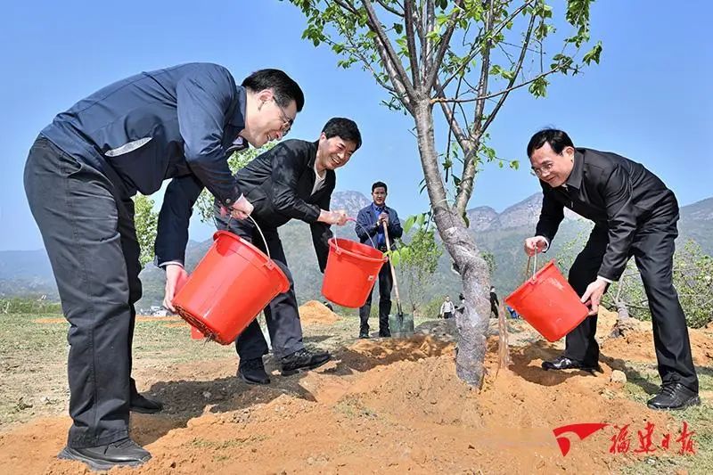 16日,周祖翼、赵龙、孔军、滕佳材等在福州参加义务植树活动。 春山在望,草木蔓发。仲春时节,五虎山国家森林公园满目葱郁、生机勃勃。一到植树点,省领导纷纷拿起工具,挥动铁锹、扶正树苗、填土踩实、围堰浇水,植树现场一片繁忙。经过大家一番忙碌,小叶榕、福建山樱花、金桂和紫玉兰等树苗稳稳挺立、临风招展,为榕城再添新绿。