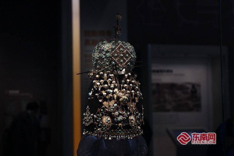在陕西考古博物馆内展示着一顶通过科学技术手段修复的女子头冠装饰 (东南网记者 颜财斌 摄)