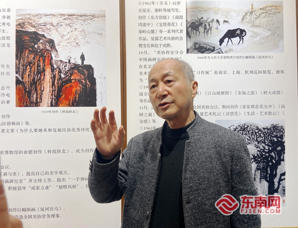西安美术学院教授、博导、美术评论家程征为大家讲解“长安画派”的历史脉络(东南网记者 颜财斌 摄) 东南网4月4日讯(本网记者 颜财斌)“一手伸向传统,一手伸向生活”。4月4日上午,“中华文明凝心铸魂之旅”2023全国网络媒体主题采访团记者走进位于陕西西安的长安画派艺术中心,近距离感受艺术家们深入生活、扎根人民,凝心聚力、守正创新的艺术风采。 “长安画派”的提法源于上世纪六十年代初期。20世纪五十年代,长安画坛在赵望云、石鲁、何海霞、方济众、康师尧、李梓盛等老一辈艺术家的积极倡导下,坚持“一手伸向传统,一手伸向生活”的创作理念,立足西北,在继承传统和面向生活的创作道路上全方位探索,歌颂中国革命,尽情描绘在中国共产党领导下的新中国人民翻天覆地的新生活。 当天上午,西安美术学院教授、博导、美术评论家程征为采访团一行详细解析了“长安画派”奠基者赵望云、石鲁、何海霞、方济众等人,在从追求个人艺术发展的道路上到共同探讨艺术,再到成立“长安画派”,帮助大家详细了解这个扎根西北的艺术画派传承与发展的历史脉络。程征还以石鲁创作《转战陕北》作品的故事为例,从作者生活经历、创作构思、作品章法以及创作态度等角度,分析传统山水画形式如何与革命历史重大题材的结合,巧妙的以有限的画面来表现无限的意境,把观者带入到一个具体的历史场景之中,并以此为大家讲述了老一辈画家对待艺术的态度和可贵的创作精神。