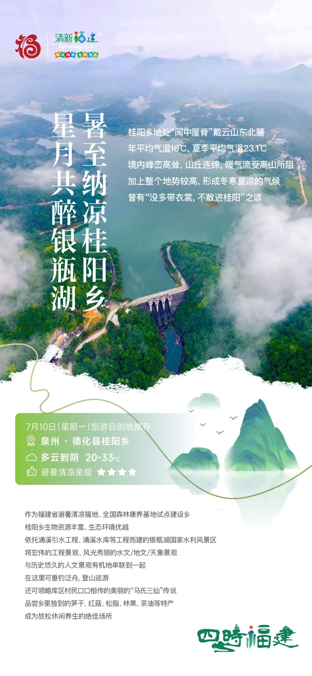 桂阳乡地处“闽中屋脊”戴云山东北麓,年平均气温16℃,夏季平均气温23.1℃。境内峰峦高耸,山丘连绵,暖气流受高山所阻加上整个地势较高,形成冬寒夏凉的气候,曾有“没多带衣裳,不敢进桂阳”之谚。作为福建省避暑清凉福地、全国森林康养基地试点建设乡,桂阳乡生物资源丰富、生态环境优越,依托涌溪引水工程、涌溪水库等工程而建的银瓶湖国家水利风景区,将宏伟的工程景观、风光秀丽的水文/地文/天象景观,与历史悠久的人文景观有机地串联到一起。在这里可垂钓泛舟,登山巡游,还可领略库区村民口口相传的美丽的“马氏三仙”传说,品尝乡里独到的笋干、红菇、松脂、林果、茶油等特产,成为放松休闲养生的绝佳场所。 |