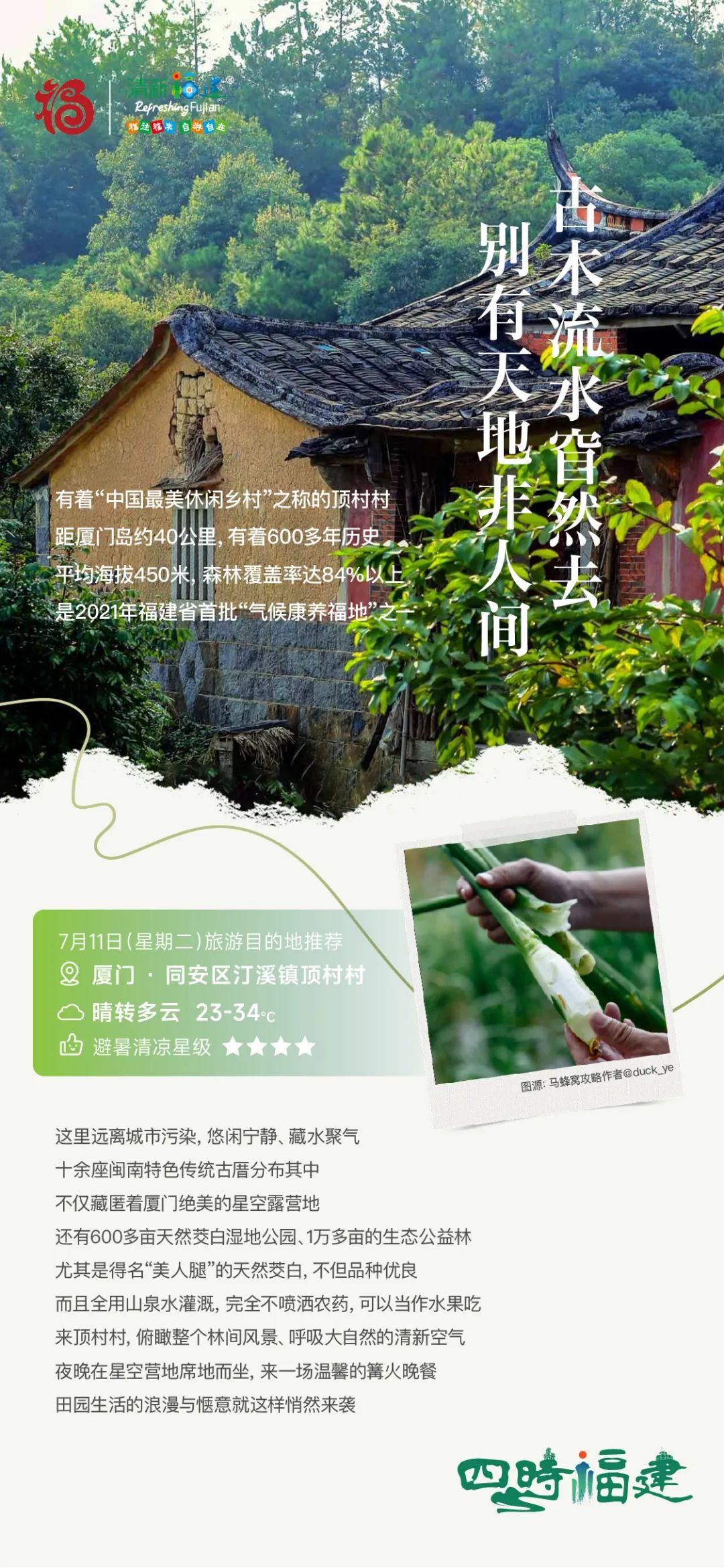 有着“中国最美休闲乡村”之称的顶村村,距厦门岛约40公里,有着600多年历史,平均海拔450米,森林覆盖率达84%以上是2021年福建省首批“气候康养福地”之一。这里远离城市污染,悠闲宁静、藏水聚气,十余座闽南特色传统古厝分布其中,不仅藏匿着厦门绝美的星空露营地,还有600多亩天然茭白湿地公园、1万多亩的生态公益林,尤其是得名“美人腿”的天然茭白,不但品种优良,而且全用山泉水灌溉,完全不喷洒农药,可以当作水果吃。来顶村村,俯瞰整个林间风景、呼吸大自然的清新空气,夜晚在星空营地席地而坐,来一场温馨的篝火晚餐,田园生活的浪漫与惬意就这样悄然来袭。 |