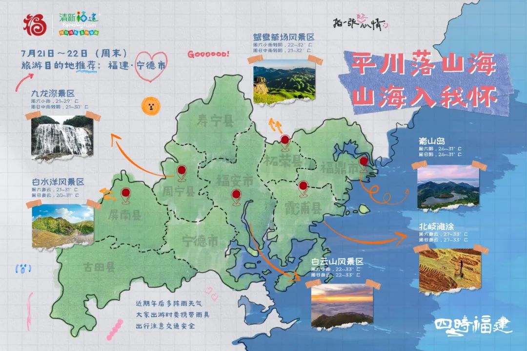 平川落山海,山海入我怀 宁德拥山抱海,钟灵毓秀,鸾翔凤集 沿着宁德柔和的曲线行走,目光拂过山峦、海岸 仿佛在聆听一曲酣畅悠扬的山海恋歌 #四时福建 7月22日-23日(周末)出游地推荐:福建·宁德市 屏南白水洋风景区 周六多云,21~31°C;周日多云,20~31°C 周宁九龙漈景区 周六小雨,21~29°C;周日中雨转阴,21~30°C 福安白云山风景区 周六中雨,22~33°C;周日多云,22~33°C 拓荣鸳鸯草场风景区(避暑清凉福地) 周六小雨转阴,22~32°C;周日中雨转阴,21~32°C 霞浦北岐滩涂 周六多云,27~33°C;周日多云,27~33°C 福鼎嵛山岛(滨海休闲度假福地) 周六阴,26~31°C;周日阴,26~31°C |