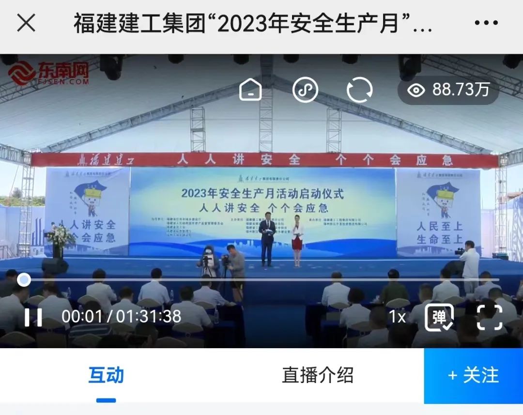 “人人讲安全,个个会应急” 2023年“安全生产月”活动启动仪式直播画面 中国网、国资委官网、学习强国、东南网、海峡网、八闽国资等省级以上媒体平台刊登集团主题教育相关内容超60篇次,打造“全景式”宣传媒体。其中,《踔厉奋发建新功,福建建工集团成立70周年健步走比赛圆满落幕》《福建建工集团以“四学”引领主题教育走深走实》连续被4家媒体转载刊登;集团学习贯彻习近平新时代中国特色社会主义思想主题教育第二次读书班新闻信息获学习强国刊载;集团结合主题教育举办“人人讲安全,个个会应急”2023年“安全生产月”活动启动仪式,福建电视台等10余家新闻媒体蜂拥采访报道,福建日报全媒体、东南网视频号、东南网微博等平台运用线上直播方式,吸引近90万人同步观摩,形成浩大的宣传声势和热烈的舆论反响。 拓展“延伸式”渠道,形成传播合力