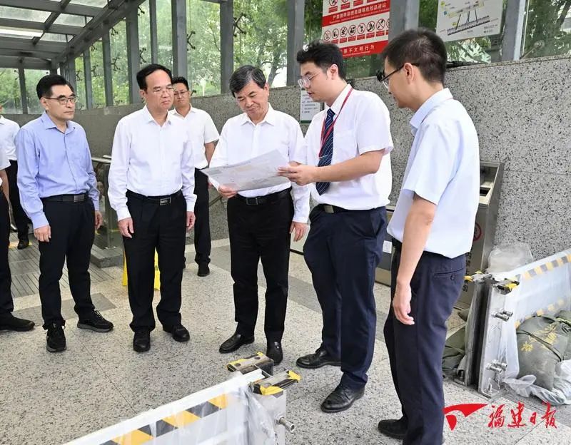 27日,周祖翼在福州地铁一号线树兜站检查防台风工作。 受台风外围环流影响,榕城风雨逐渐增强。风雨来袭时,福州交通、市政、城建、电力等各部门的干部职工坚守岗位,努力守护万家平安。地铁作为城市公共交通的主动脉,是迎战台风的重要一环。周祖翼一行来到地铁一号线树兜站口,看到一包包防汛沙袋和防洪挡板已移至出入口通道、贴墙整齐摆放,他详细向站点负责同志了解防台风预案、物资配备、应急演练等情况,并察看了车站控制室,叮嘱他们要根据台风影响程度及时采取相应的措施,加强安全检查巡查,确保地铁运营及乘客出行安全。在低洼易涝点福飞北路下穿通道,“龙吸水”等大流量移动排水泵车已经到位。周祖翼走进雨水泵站了解防涝应急方案,与正在备战的抢险人员握手交流,要求提前合理预置排涝设备,做到第一时间抢排积水,防止城市内涝。周祖翼一行冒雨走进琴亭湖公园及其泵站,了解琴亭湖蓄洪防洪功能,认真询问当前水位,提醒有关负责同志对城区主要水体要提前调蓄、降低水位,腾出库容应对台风可能带来的强降雨。福州主城区的积水主要通过管网流入内河、再经排涝站排入闽江。周祖翼来到晋安河、光明港水系的重要排涝出口魁岐排涝站,详细了解城区排水防涝主通道调度以及人员、设施配备情况,并察看了城市排水应急救援基地。他感谢大家的辛勤付出,并要求福州市充分用好水闸和排涝站,科学精确调度,确保排水畅通。