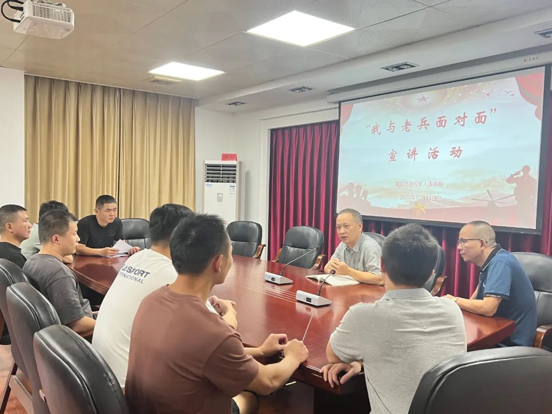 10月11日下午,南安市退役军人事务局利用召开退役士兵接收安置会的时机,对选择南安安置的2023年度由政府安排工作退役军人开展”我与老兵面对面“宣讲活动。 宣讲活动中,优抚安置科负责人王文斌结合多年的工作实践,向退役军人解读优抚安置相关政策,并介绍了一些退役士兵在工作中作出显著成绩的成功范例,亲切地互动,娓娓道来,声声入耳,吸引着退役士兵们聚精会神地听讲。思政科负责人徐加龙从增强职业素养、保持军人本色、展现军人风采等几个方面,与在座各位退役士兵进行密切的交流沟通,引起了大家的共鸣。与会的退役军人深有感慨地说:“这种心贴心的面对面活动,亲切实在,又让大家从中受益匪浅。”