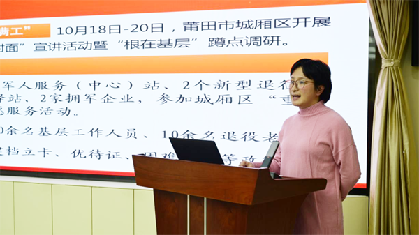 第六服务小分队队长、省军供站一级科员王宸说,努力不是三分钟热度,坚持才是王道拳头。此次宣讲调研活动,大家在学习交流中积累经验,在实践活动中历练成长,深刻体会到厅党组对青年干部的重视培养和寄予厚望。接下来,我们要一如既往地永葆崇军爱军情怀和热度,迎难而上,勇毅前行,始终以“充电强能、冲锋向前”的姿态,竭尽所能为服务对象解难事办实事,以实际行动推动福建“惠军工程”向深度广度发展。 厅机关和省烈保中心干部职工在主会场,其他所属单位干部职工在各分会场以视频形式参加此次活动。 |