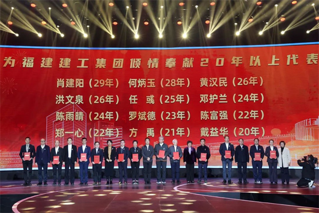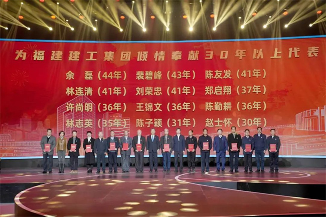 在福建建工集团70年历史中,涌现出了一大批爱岗敬业的干部职工,作为中坚力量的他们,经受住了岗位的淬炼、抵挡住了时光的淘洗,数十年如一日在平凡岗位上默默耕耘,与企业同风雨、共呼吸,为企业奉献了自己最美好的青春年华。纪念大会上,集团领导和来宾代表分别向倾情奉献20、30年及以上的员工代表颁发纪念证书。 大会开幕前,来自集团总部、省安装公司、工程公司、基础公司和环海公司的7名建工青年运用电声乐队、rap等流行音乐手法,燃情演绎建工之歌——《匠心筑梦(青春版)》,瞬间将来宾带入喜庆热闹的氛围中。