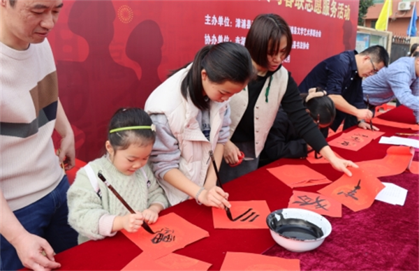 小朋友们在活动现场写对联。 现场的小朋友帮忙传递红纸,充当“小志愿者”给书法家们搭把手。 现场人员一边欣赏、赞美着志愿者们的书法作品,一边挑选着自己心仪的春联,喜悦之情溢于言表。书法爱好者们或是自由发挥,或是应村民要求“私人订制”,以笔墨承载祝福,创作出寓意美好的春联和“福”“春”字。值得一提的是,现场还有5位小小书法爱好者也在写“春”和“福”字,表达内心的满满祝福。这些春联、“春”和“福”字写好就送给村民,整场义写春联供不应求。