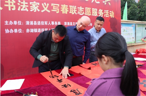 义写春联送祝福,欢天喜地迎新春。为弘扬优良传统文化,唱响文明风主旋律,漳浦县退役军人事务局联合县文学艺术界联合会在赤湖镇举办以“喜迎新春 情暖老兵”为主题的退役军人书法家义写春联志愿服务活动,免费为辖区居民发放春联,让当地群众切实感受到传统文化和浓浓的节日气息。