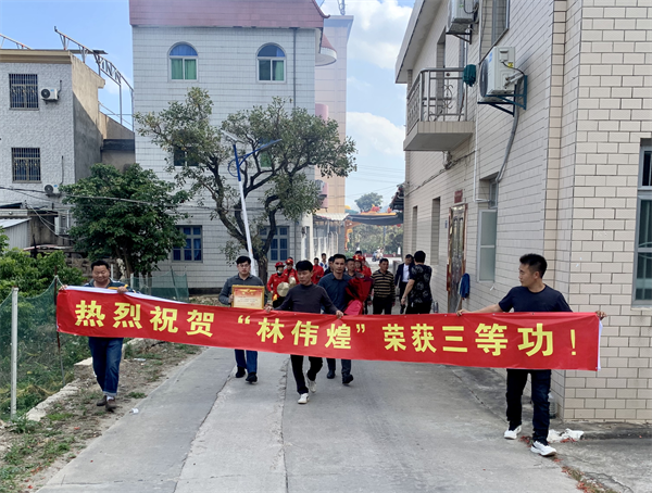 为现役军人三等功获得者林伟煌家属送喜报 当天,云霄县退役军人事务局还分别为李汉铭、吴伟圣、陈居正、林伟煌、罗恒海等5名现役军人家庭送去喜报。云霄县双拥办负责人表示,希望通过开展为立功军人家属送喜报活动,增强军人军属的荣誉感和自豪感,营造全社会尊崇军人的浓厚氛围,不断激励现役军人扎根军营、建功立业的坚定决心,激发广大优秀青年踊跃报名参军、报效祖国的热情。 |