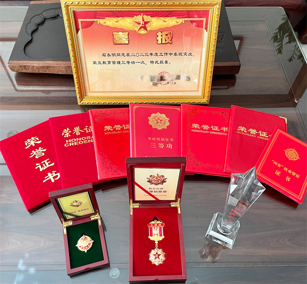 现役军人石永明获得的荣誉证书、奖章、奖杯 “作为一名军嫂,更加理解军人的艰辛与不易,我永远是他最坚实的后盾,希望他能全身心扎根军营,为国防事业添砖加瓦。”接过满载着荣誉的喜报,石永明的妻子许佳莉喜悦与自豪之情溢于言表。